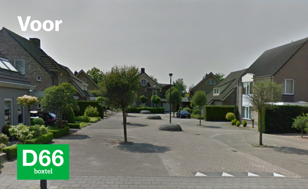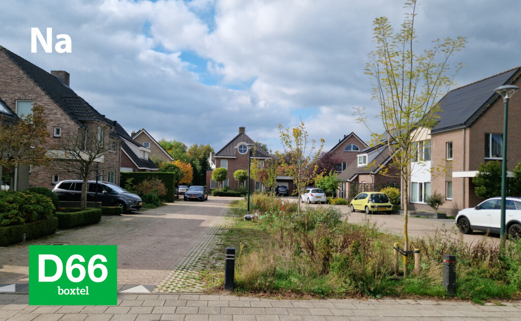 De doodlopende straat Schuttershof was behoorlijk versteend. Op een paar treurige boompjes na was er geen groen te vinden. Toen D66 de groene kansenkaart presenteerde en inwoners uitdaagde om ideeën aan te dragen, werden buurtbewoners enthousiast om ook hun straat te vergroenen. Van steen, lantaarnpalen en een paar kleine boompjes naar een echt klimaatadaptieve straat.