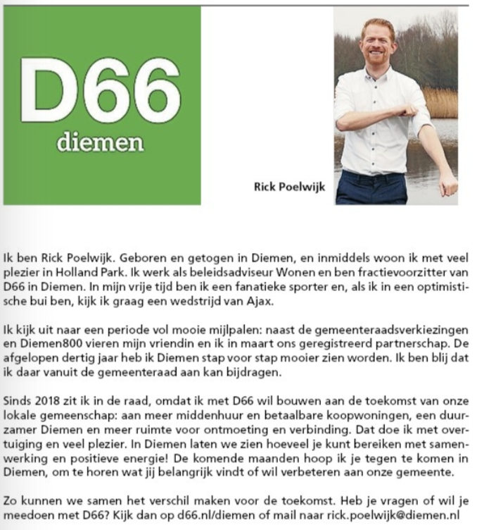 D66 Diemen heeft een column geschreven in het Diemernieuws met de titel 'Positieve energie voor Diemen.'