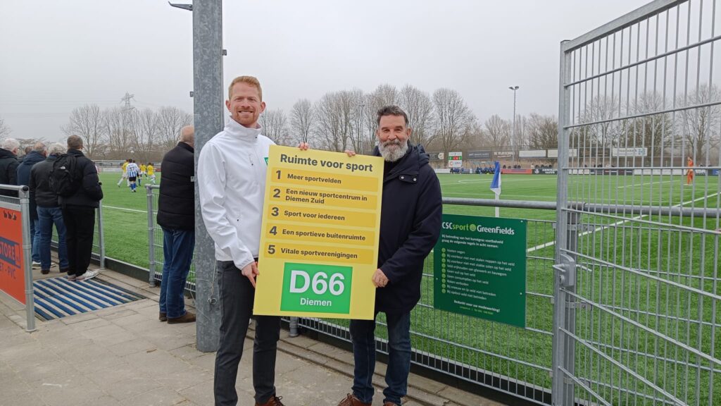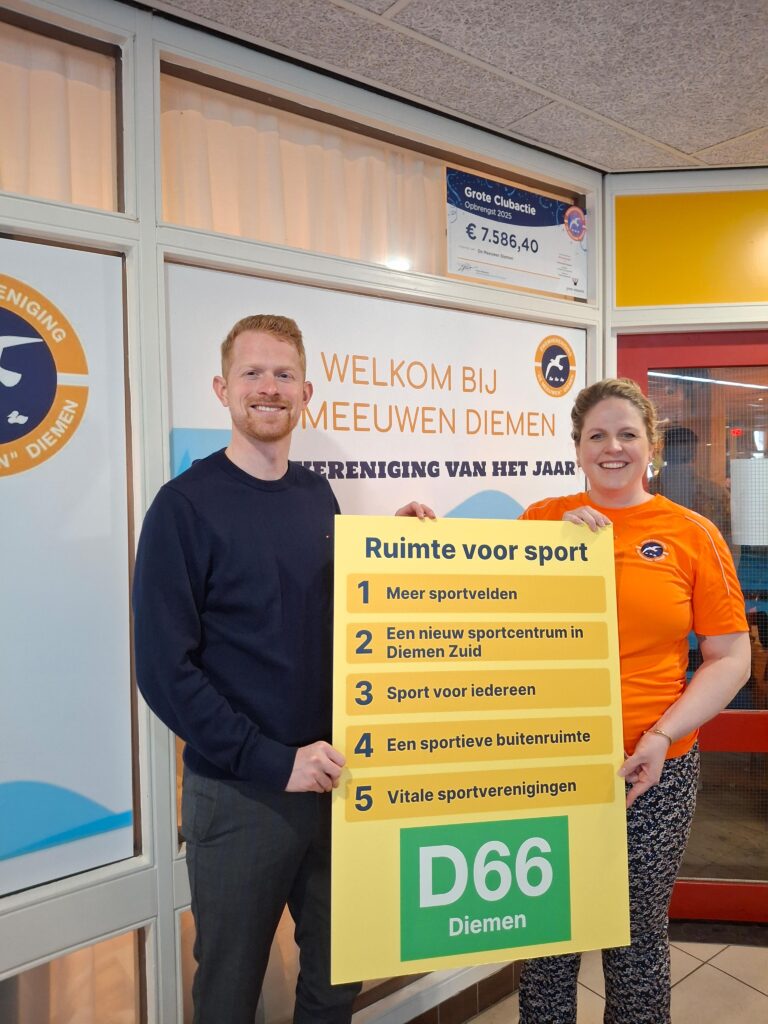 “D66 wil bouwen aan onze Diemense gemeenschap. Daarom willen wij volop investeren in sport: het brengt sporters, supporters en vrijwilligers op een unieke manier samen,” zegt Rick Poelwijk, lijsttrekker van D66 Diemen. “We hebben de afgelopen jaren al veel gedaan voor sport in Diemen, met onder andere een nieuwe sporthal. Tegelijkertijd zien we dat sportvoorzieningen onder druk staan in een groeiende gemeente. Daar moeten we mee aan de slag.”
