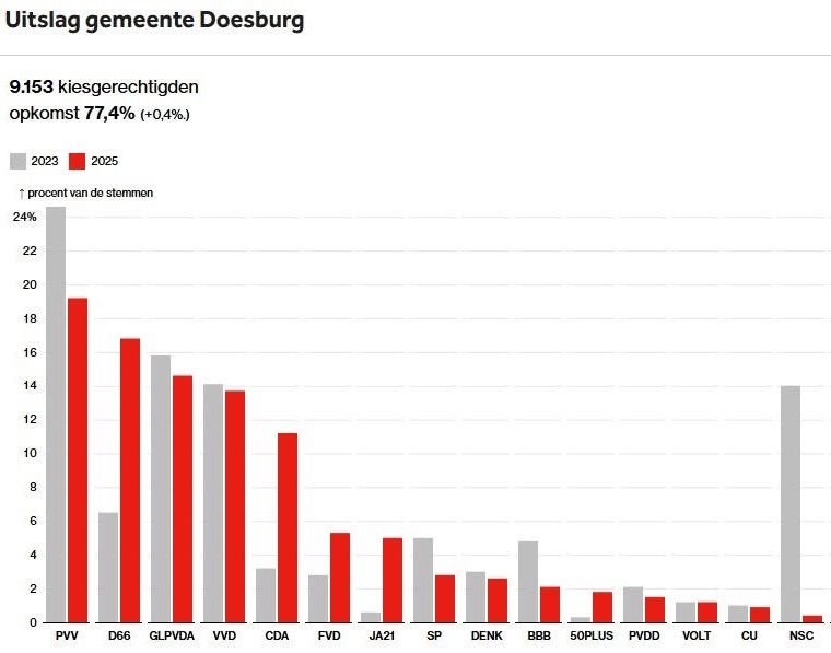 Op 24 april 2025 presenteren PvdA/GroenLinks, D66, VVD en CDA met plezier het hoofdlijnenakkoord “De Nieuwe Coalitie werkt aan kansen”. Na het opstappen van Stadspartij Doesburg uit de vorige coalitie…