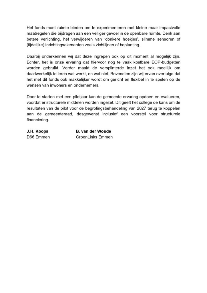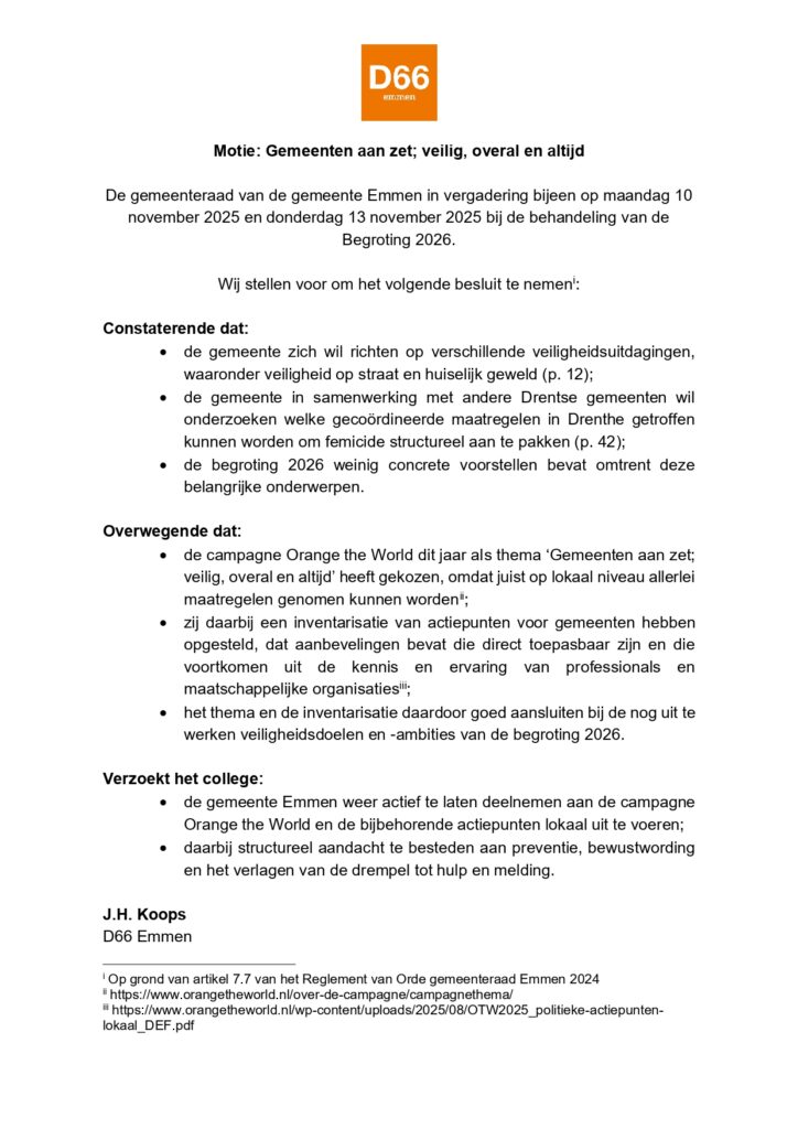 Een ander onderwerp waarvoor wij en met ons meerdere partijen aandacht hebben gevraagd bij de beschouwingen is veiligheid. En ook voor wat betreft dit onderwerp zien wij nog wel ruimte voor aanvullingen en aanscherpingen. Zo kijken wij met waardering naar de focus die de begroting legt op onderwerpen als sociale wijken en dorpen, veiligheid op straat, huiselijk geweld en femicide. Echter missen wij nog wel concrete voorstellen rond deze belangrijke onderwerpen. D66 dient om die reden een amendement en een motie in, waarmee wij in dat gat willen springen. Met ons amendement willen wij een tijdelijk pilotfonds instellen, gericht op een veilige en welkome openbare ruimte. Met dit fonds willen wij ruimte bieden voor kleinere maatregelen die bijdragen aan een veiliger gevoel, en willen wij het makkelijker maken om van deze ingrepen te leren, en om flexibeler in te kunnen spelen op de wensen van inwoners en ondernemers. Met onze motie willen wij opnieuw aandacht voor de belangrijke campagne van Orange the World. Zeker dit jaar heeft Orange the World gekozen voor een campagne gericht op maatregelen die lokaal genomen kunnen worden, en heeft zij een groot aantal actiepunten geschreven die direct toepasbaar zijn. Wij roepen het college dan ook op om weer actief deel te nemen aan de campagne van Orange the World en om deze actiepunten aan te grijpen om invulling te geven aan haar ambities op het gebied van veiligheid. Verder willen wij in het kader van veiligheid ook nogmaals oproepen om zo snel mogelijk prioriteit te geven aan het veiliger maken van onze stationsgebieden, en dit veiligheidsvraagstuk los aan te vliegen van de komst van de Nedersaksenlijn.