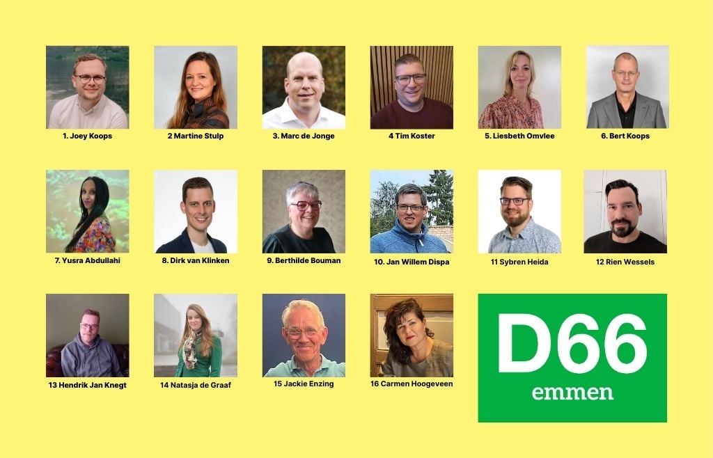 Op nummer 2 staat Martine Stulp uit Emmen, gevolgd door Marc de Jonge, eveneens uit Emmen, op plek 3. Beiden zijn ervaren commissieleden en brengen waardevolle kennis mee om de stap naar het raadswerk te zetten. De vierde plaats is voor Tim Koster uit Barger-Compascuum, die al ervaring heeft opgedaan als commissielid in Stadskanaal en Borger-Odoorn. Liesbeth Omvlee, eveneens uit Emmen, maakt de top 5 compleet.