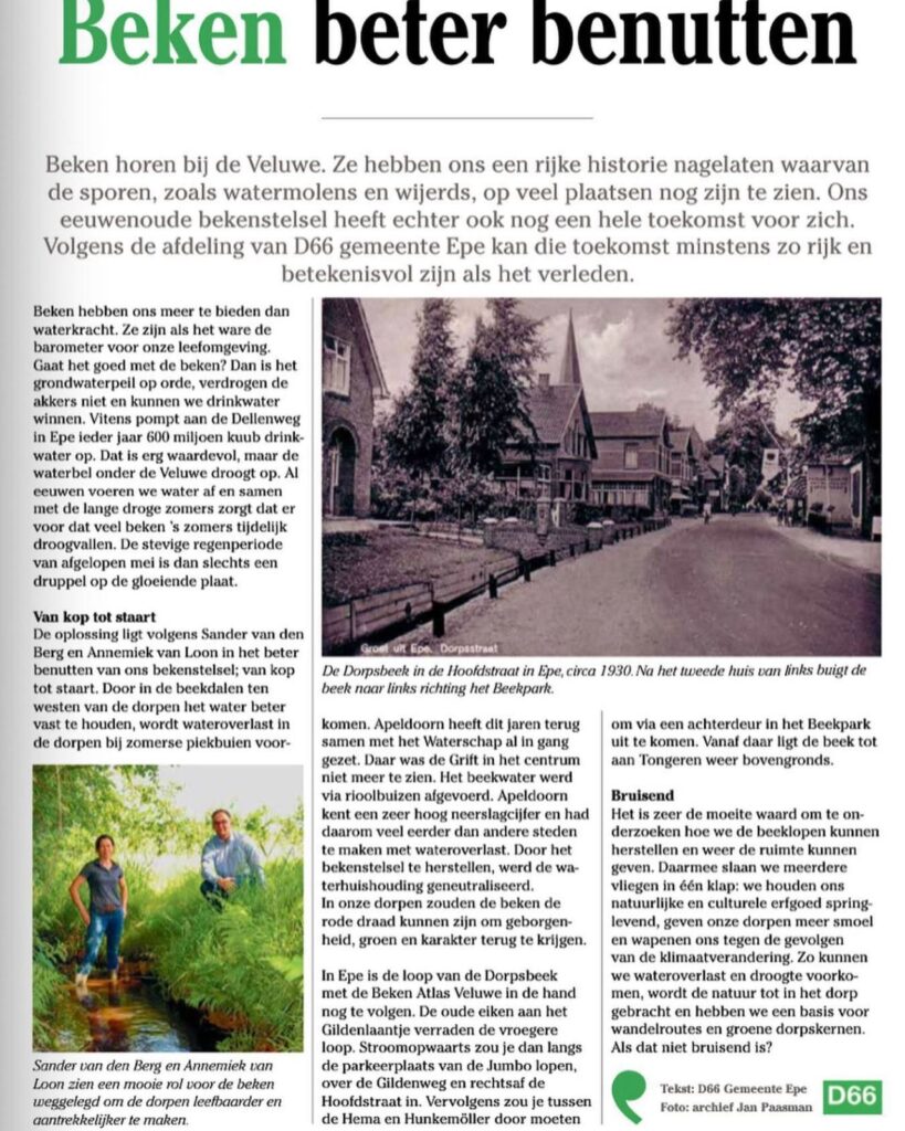 In juni 2021 vestigden Annemiek van Loon en ik aandacht op het belang van de beken in onze omgeving en riepen we op tot een onderzoek. Gisteren bespraken we in de gemeenteraad van de Gemeente Epe de resultaten van het Haalbaarheidsonderzoek Bovengrondse Dorpse Beek.