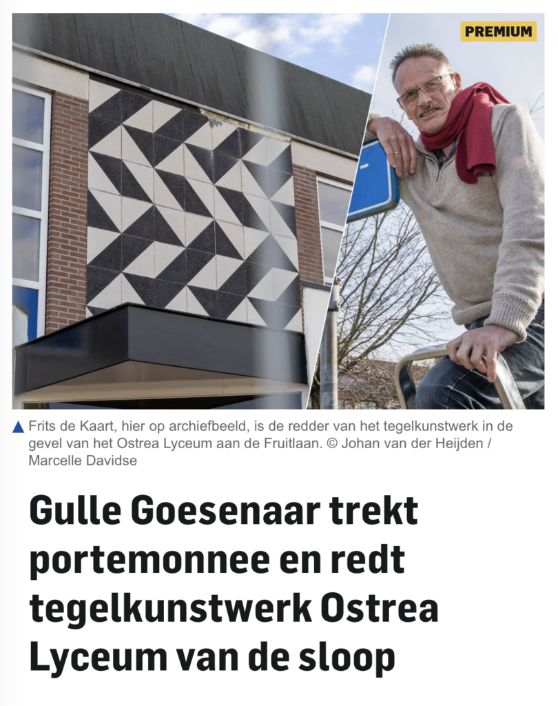 Wat eerst verloren leek, is toch gelukt! Dankzij de inzet van ons steunfractielid Levien de Putter, de steun van andere partijen en de aandacht die we samen hebben gevraagd, blijft het kunstwerk van Nico van den Boezem bij het oude Ostrea Lyceum behouden. Een betrokken Goesenaar neemt de kosten op zich voor het veilig verwijderen van het werk. Zo blijft een bijzonder stuk Goese wederopbouwkunst bewaard voor de toekomst, een resultaat waar we als D66 Goes trots op zijn! 💚