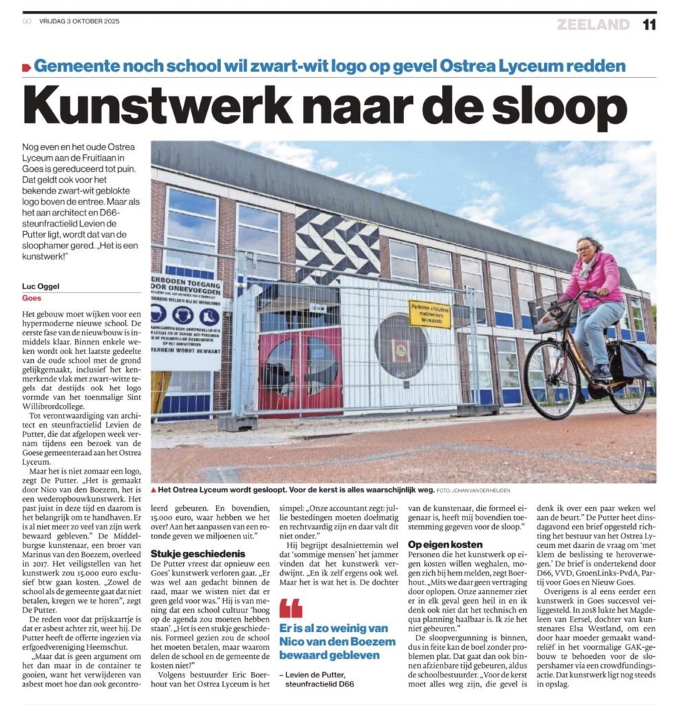 Wat eerst verloren leek, is toch gelukt! Dankzij de inzet van ons steunfractielid Levien de Putter, de steun van andere partijen en de aandacht die we samen hebben gevraagd, blijft het kunstwerk van Nico van den Boezem bij het oude Ostrea Lyceum behouden. Een betrokken Goesenaar neemt de kosten op zich voor het veilig verwijderen van het werk. Zo blijft een bijzonder stuk Goese wederopbouwkunst bewaard voor de toekomst, een resultaat waar we als D66 Goes trots op zijn! 💚