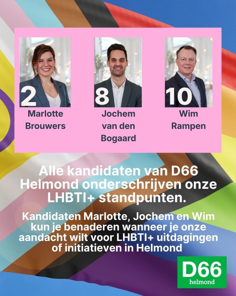 Daarnaast heeft D66 Helmond drie kandidaten die zich in het bijzonder inzetten voor de vrijheid van LHBTI+-personen in onze stad: Marlotte Brouwers, Jochem van den Bogaard en Wim Rampen.