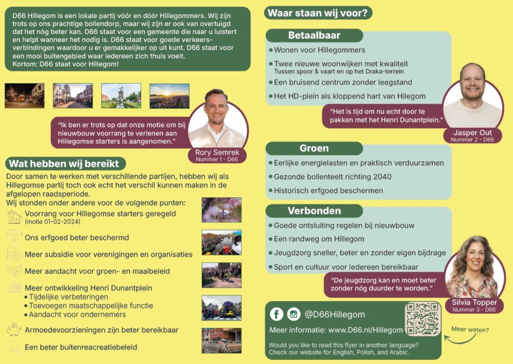 Ook voor deze gemeenteraadsverkiezingen hebben we onze belangrijkste standpunten weer op een rijtje gezet in een flyer. Daarnaast laat de flyer een selectie zien van de mensen die voor onze partij op de kandidatenlijst staan én mensen die, net als heel D66 Hillegom, vóór Hillegom staan!