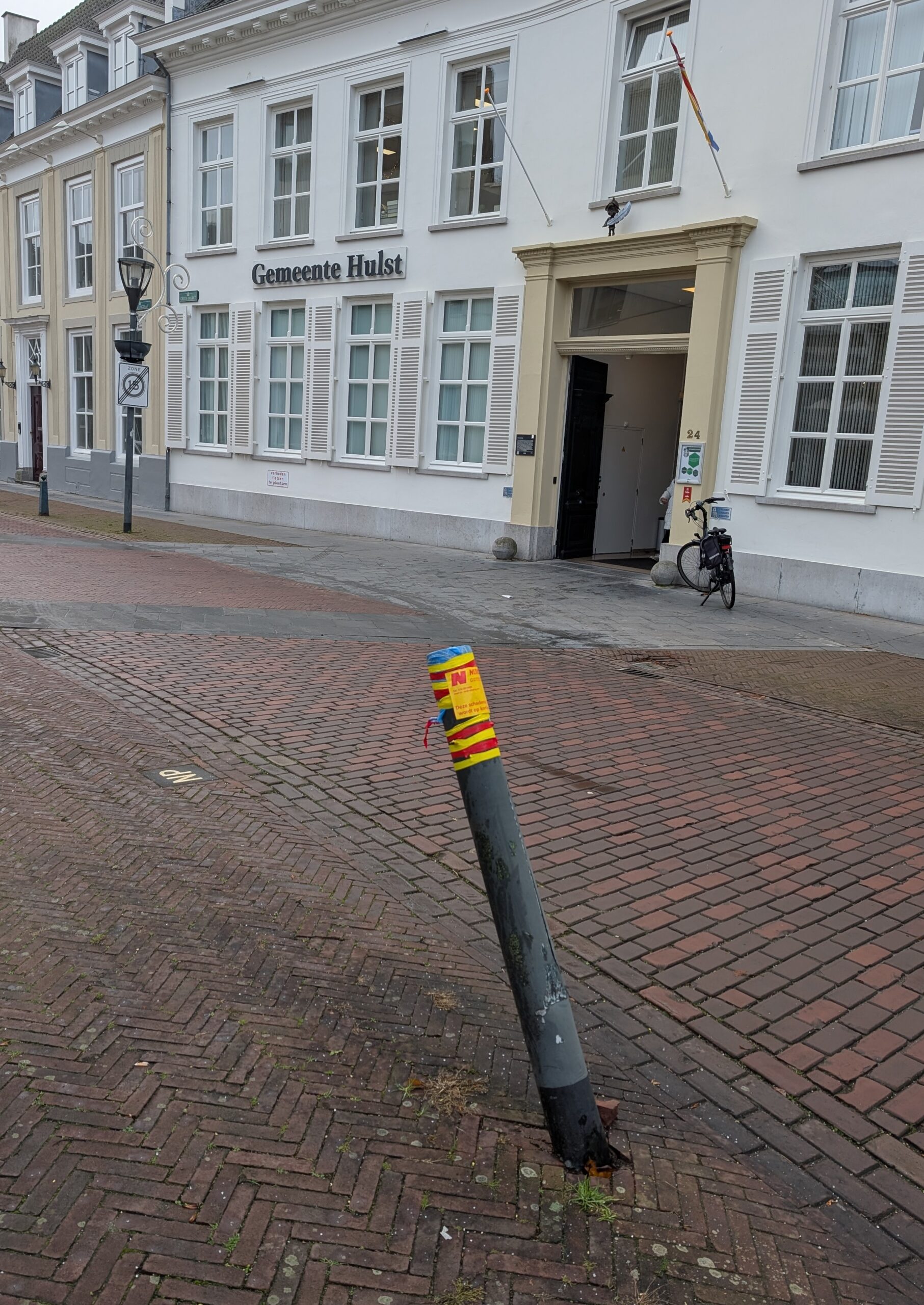 Ook een paal bij de ingang van de school, kan voor gevaarlijke situaties zorgen. Je moet er niet aan denken dat op deze donkere dagen een kindje over het hoofd wordt gezien?
