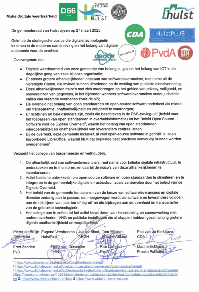 Een belangrijke overwinning voor de digitale veiligheid van onze gemeente. De gemeenteraad van Hulst heeft in grote meerderheid ingestemd met de D66-motie ‘Digitale Weerbaarheid’. Hiermee spreekt de raad zich uit: we moeten af van de risicovolle afhankelijkheid van grote techbedrijven en de regie over onze eigen ICT terugpakken. Een krachtig signaal, dat door bijna de gehele raad werd gesteund – met uitzondering van de VVD.
