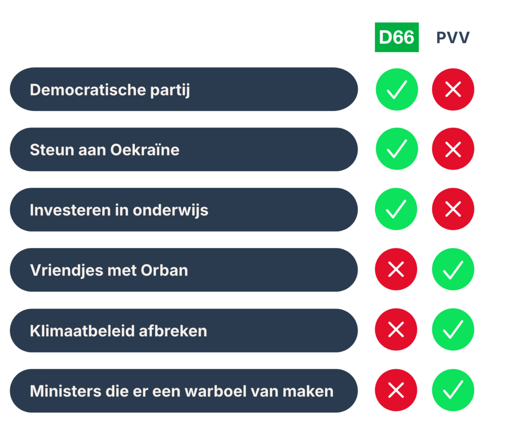 D66 en de PVV staan ver uit elkaar. Op inhoudelijke onderwerpen, maar vooral naar hoe we kijken naar de democratie en onze samenleving. Zolang de PVV blijft discrimineren en de democratische rechtsstaat afwijst zullen we niet met hen samenwerken.
