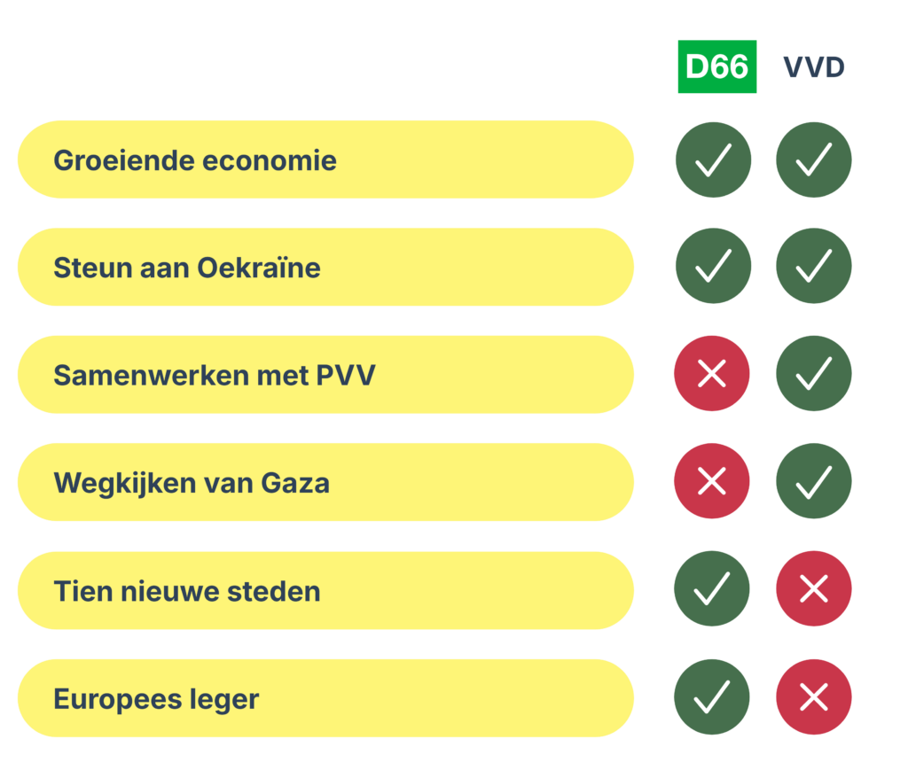 D66 kijkt optimistisch naar de toekomst. We willen vernieuwen en geloven dat morgen beter kan zijn dan vandaag. De VVD is steeds meer verworden tot een conservatieve club, die samenwerkt met de PVV.