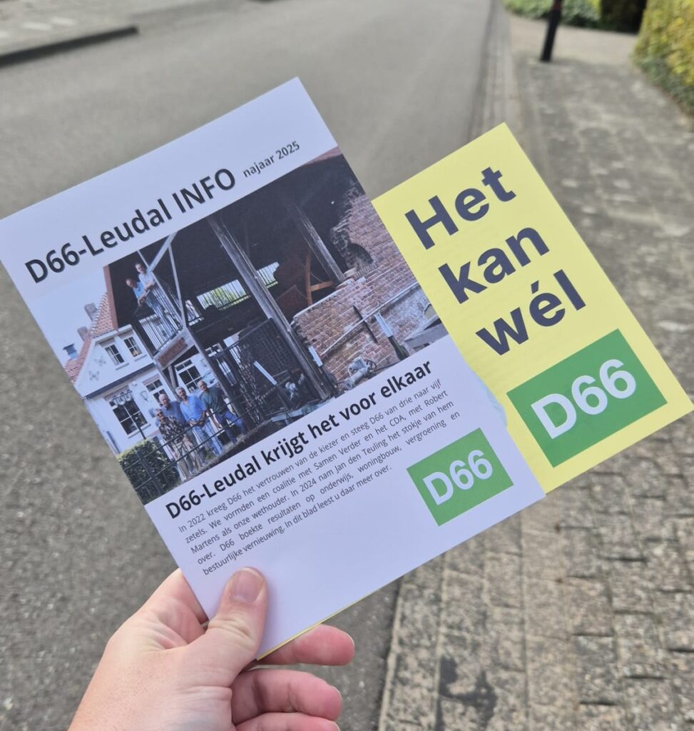 Als fractievoorzitter van D66 Leudal vind ik het belangrijk u regelmatig bij te praten over wat wij doen in de gemeenteraad. Dat doen we via dit infoblad, onze website en sociale media. Maar nog liever spreken we u persoonlijk. Iedere week bezoeken wij initiatieven, verenigingen of bedrijven in onze dorpen. Zo horen wij wat er écht speelt en hoe wij als politiek kunnen helpen. Wilt u dat wij ook bij u langskomen? Laat het gerust weten.
