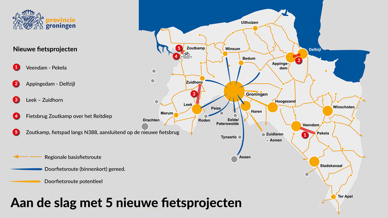 In totaal is er ruim 19 miljoen euro beschikbaar voor de opwaardering van het fietsnetwerk in Groningen, grotendeels vanuit het Uitvoeringsprogramma Fiets (pdf). Later dit jaar beslist de provincie hoe en aan welke verbindingen het gros van dit bedrag wordt besteed. Vooruitlopend hierop zijn nu echter al vijf projecten met prioriteit aangewezen, zodat deze sneller gerealiseerd kunnen worden. Het gaat om comfortabele fietsroutes tussen Appingedam en Delfzijl, Zuidhorn en Leek en een deel van de route tussen Veendam en Pekela. Daarnaast wordt een nieuwe fietsbrug over het Reitdiep bij Zoutkamp gerealiseerd en een vrijliggend fietspad dat hierop aansluit.