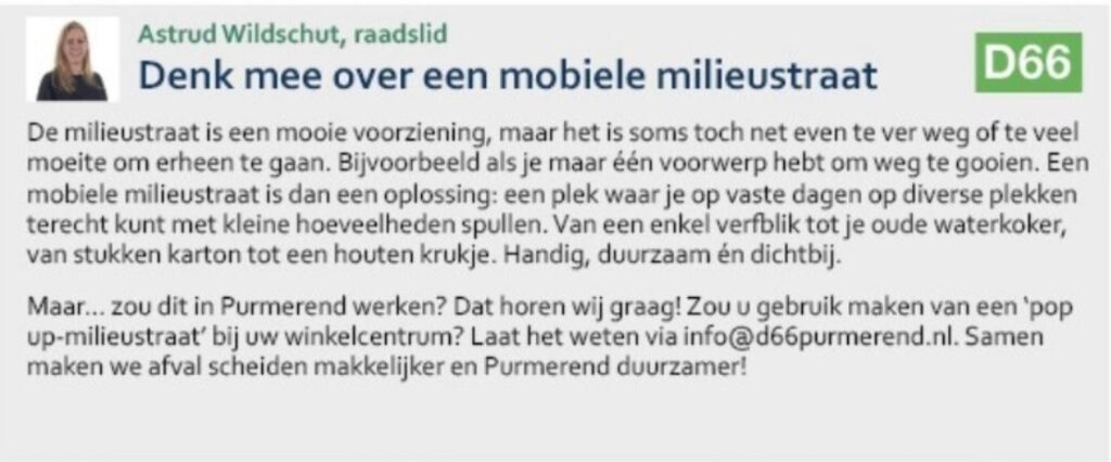 Maar… zou dit in Purmerend werken? Dat horen wij graag! Zou u gebruik maken van een ‘pop up-milieustraat’ bij uw winkelcentrum? Laat het weten via [email protected].