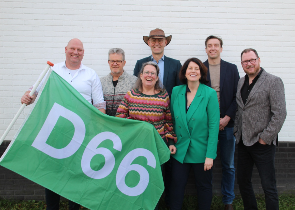 Op de foto van links naar rechts: Paul Wilbrink, Rolf Andringa, Daniëlle Vlasman, Frits van der Schans, Liesbeth Faas, Yorick van Rijthoven en Tom van Engelen. - Beeld: D66 Maasdriel