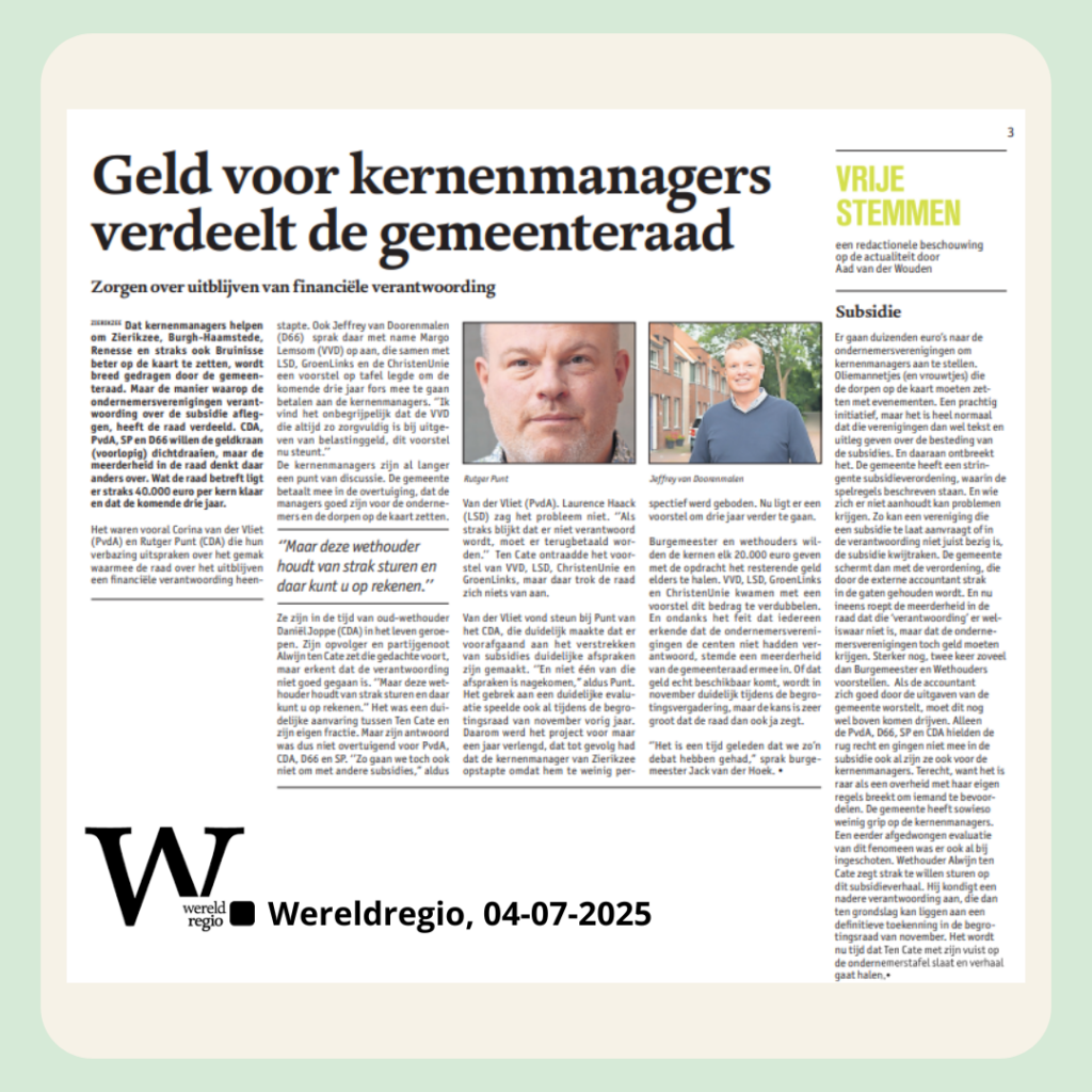 In juni was er een stevig debat in de gemeenteraad over iets waar wij eerder ook al kritisch over zijn geweest: de subsidie voor kernenmanagers. Met deze subsidie kunnen ondernemersverenigingen uit een aantal kernen in Schouwen-Duiveland, een kernenmanager aanstellen om te helpen het dorp of de stad op de kaart te zetten. Opzich een goed initiatief natuurlijk, zeker als dat leidt tot mooie evenementen. Het probleem is alleen dat het tot op heden ontbreekt aan financiële verantwoording van deze subsidie. Oftewel: het is onduidelijk hoe het geld is besteed en wat het heeft opgeleverd. En dat zijn hele normale vragen om te stellen. Immers, dat verwachten we van iedere vereniging die subsidie (en dus belastinggeld) van de gemeente ontvangt. Nu zou je denken: deze gang van zaken zullen het college en de fracties in de raad vast niet oké vinden.