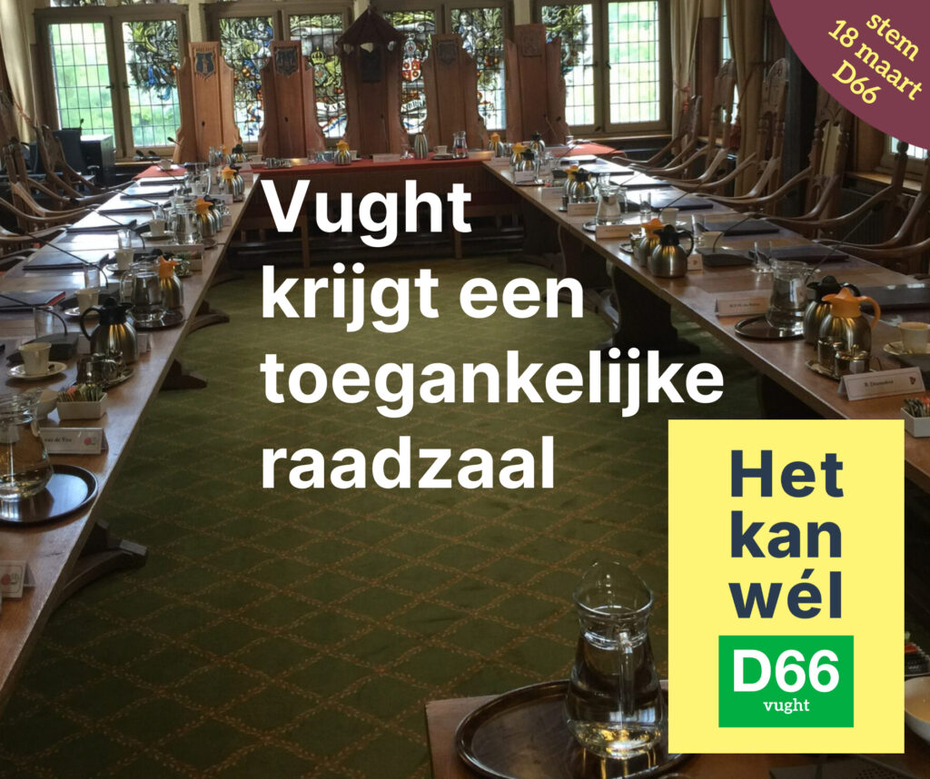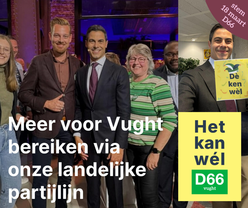 D66 wil 18 maart met de beste plannen voor Vught, Helvoirt en Cromvoirt weer als grootste uit de bus komen. Dat werden we de vorige gemeenteraadsverkiezingen al in het dorp Vught. En in de hele gemeente Vught werden we bij de laatste verkiezingen voor de Tweede Kamer met 25% van de stemmen met afstand de grootste. Het kan wél.