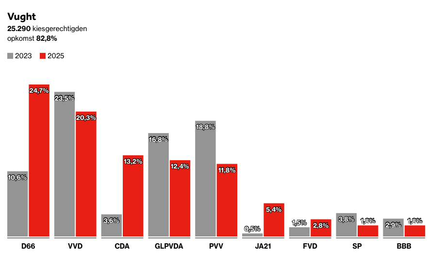 Steeds meer mensen die nooit eerder D66 stemden doen dat nu wel, omdat de ideeën van de partij bij het dagelijkse leven van een zeer grote groep Vughtenaren aansluiten. Of het nu gaat over het afmaken van het centrum door de Marktveldpassage te slopen, de verdieping van het spoor, het meest ruimhartige armoedebeleid van de regio, de herontwikkeling van de Isabellakazerne van onderaf, de vernieuwing van riolering in combinatie met de straten of het volop ondersteunen van mooie allerlei initiatieven zoals Ouderen Samen, Wildgroei, de Cromvoirtse buurtbus, VET Vught en Samen voor Vught.Stemwijzer