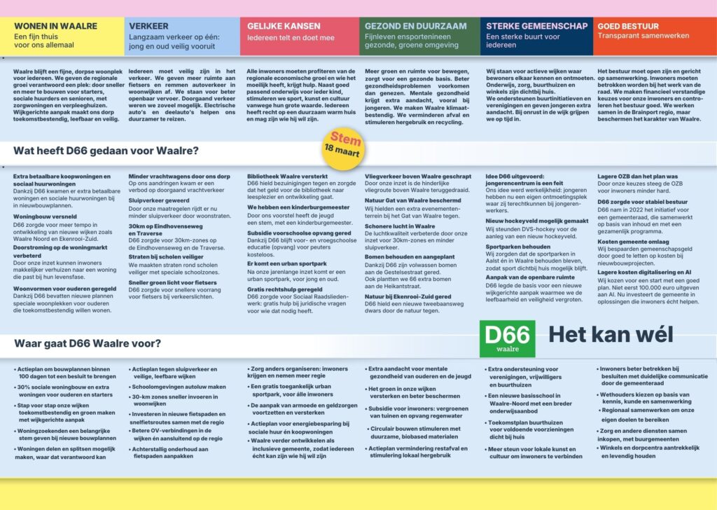 Samen met inwoners, ondernemers en leden hebben we nagedacht en gesproken over onze ideeën voor de toekomst. In het verkiezingsprogramma en het kortere verkiezingsmenu lees je deze plannen waarmee D66 de komende jaren in Waalre aan de slag wil gaan.