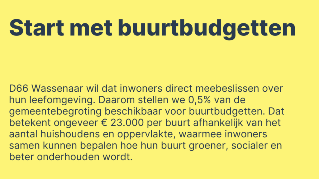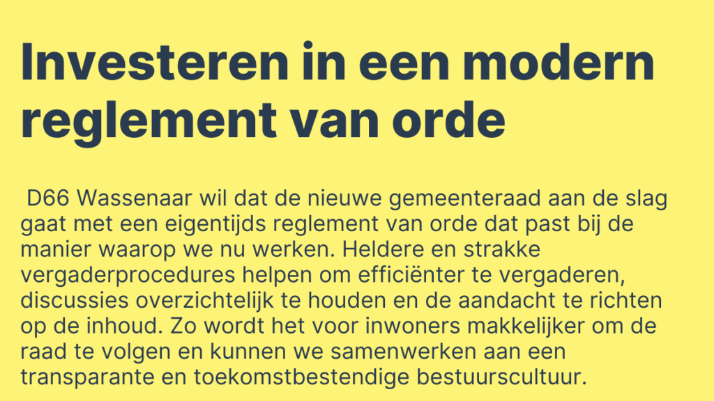 Heel veel mensen in Wassenaar zijn actief betrokken bij het dorp. De vele vrijwilligers en ondernemers komen met tal van ideeën om het om het dorp te verbeteren. De gemeente Wassenaar heeft inwonersparticipatie hoog in het vaandel staan maar het komt nog te vaak voor dat mensen of inwoners de weg in het bestuurlijke domein niet kunnen vinden of dat het gemeentelijke apparaat niet actief aan de slag gaat met burgerinitiatieven. De bestuurscultuur van Wassenaar moet veranderen, in de 21 eeuw bestuur je niet voor maar met de inwoners en ondernemers.
