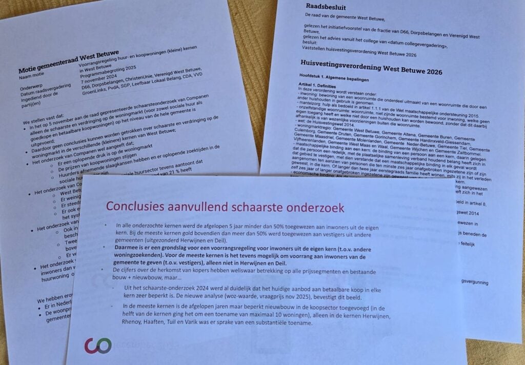 Kernbinding ook invoeren bij de toewijzing van sociale huurwoningen blijkt op dit moment nog een stap te ver. Hiervoor is meer medewerking van de woningbouwcorporaties nodig. De huisvestingswet biedt ons als gemeente wel die mogelijkheid, mits dat met cijfers kan worden aangetoond. Er moet naast schaarste ook een zeer lage kans, de zogenaamde verdringing, zijn voor inwoners om zo’n woning te bemachtigen. Naar die schaarste en verdringing heeft de initiatiefgroep aanvullend onderzoek laten doen door een extern bureau. De uitkomsten daarvan waren heel bevredigend. Er speelt zowel schaarste als verdringing bij betaalbare nieuwbouw koopwoningen en bij sociale huurwoningen in de kleinere kernen. Dit biedt voldoende onderbouwing om de invoering van kernbinding te rechtvaardigen.
